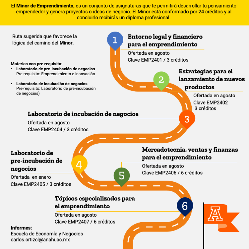 El Minor de Emprendimiento, es un conjunto de asignaturas que te permitirá desarrollar tu pensamiento emprendedor y generar proyectos o ideas de negocio. Minor conformado por 24 créditos.